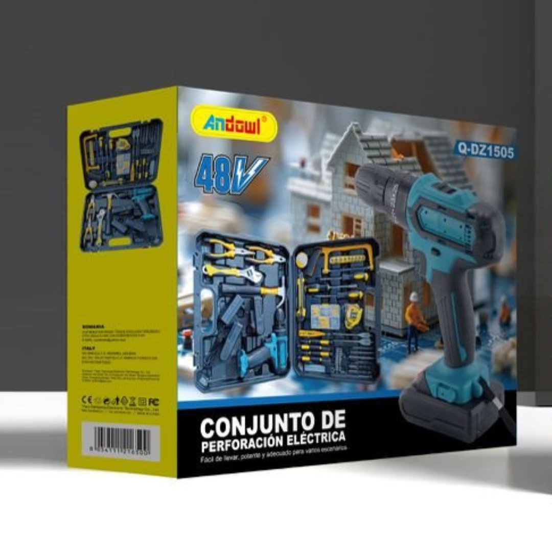O Andowl Q-DZ1505 é um conjunto de ferramentas prático que inclui uma potente furadeira elétrica de 48 V com bateria recarregável e uma rica coleção de acessórios.