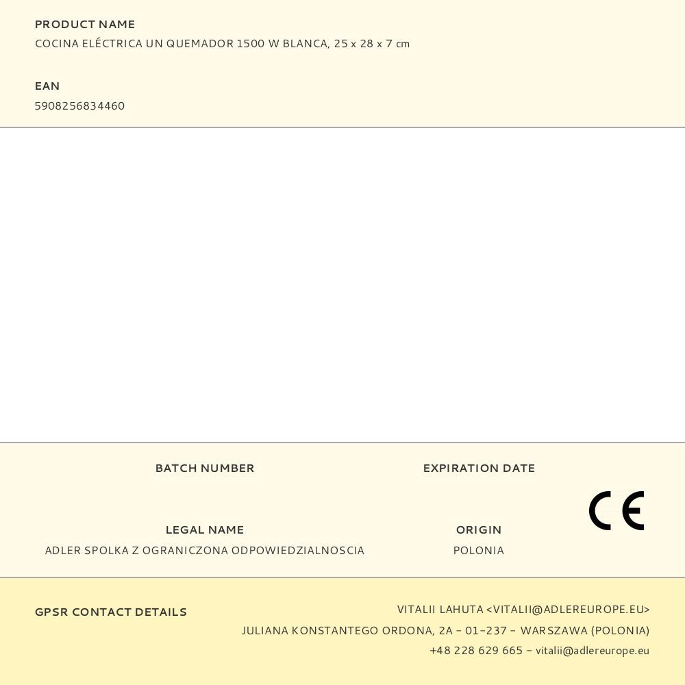 FOGÃO ELÉTRICO 1 QUEIMADOR 1500 W BRANCO, CORPO DE AÇO, FOGÃO DE Ø 185 mm, 5 NÍVEIS DE AQUECIMENTO, PÉS DE BORRACHA ANTIDERRAPANTES, LUZ INDICADORA, CABO DE ALIMENTAÇÃO DE 85 cm, 220-240 V ~ 50/60 Hz, 25 x 28 x 7 cm