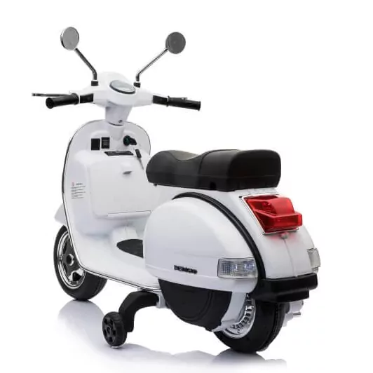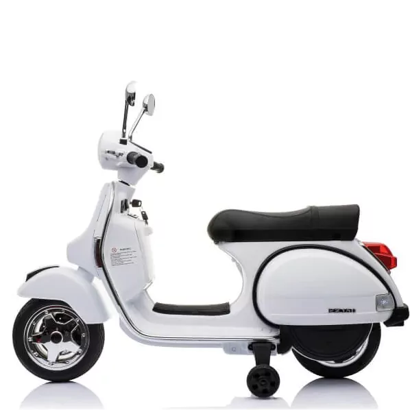 Scooter elétrica Vespa oficial – Piaggio com bateria 12v para meninos e meninas. Moto esculpida até o último detalhe, alças cromadas e faróis, assento acolchoado e couro para conforto da criança. Rodas de suporte removíveis.