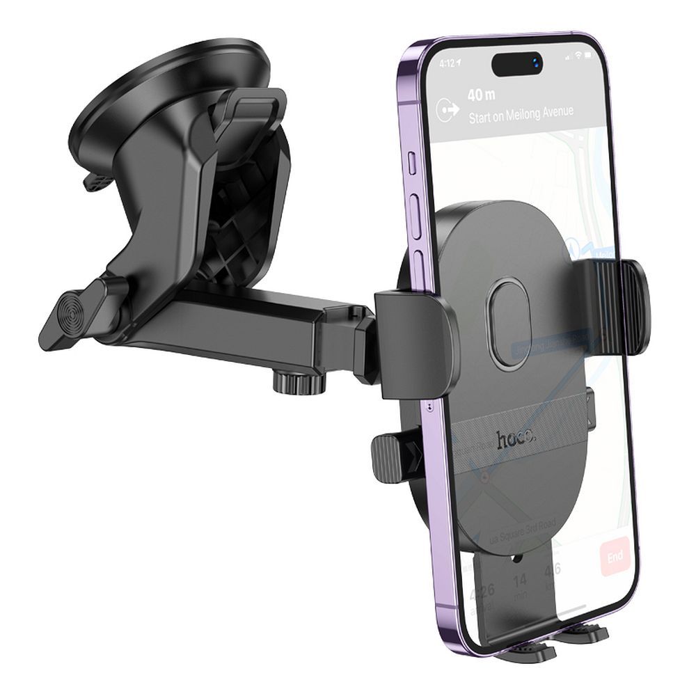 Um suporte universal para carro que se fixa ao painel ou ao para-brisa. O braço ajustável com cabeça giratória de 360° permite ajustar perfeitamente a posição do dispositivo às suas necessidades, na vertical ou na horizontal.
