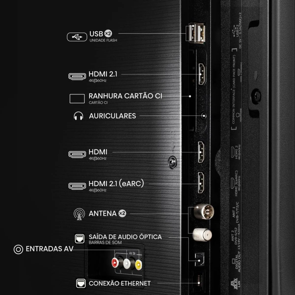 Três portas HDMI 2.1, duas USB, Wi-Fi, Bluetooth 5.0 e Ethernet permitem-te ligar consolas, soundbars, computadores e muito mais. Cria o setup perfeito para entretenimento, trabalho ou lazer, sem limitações.